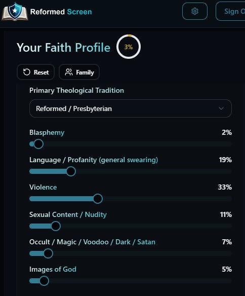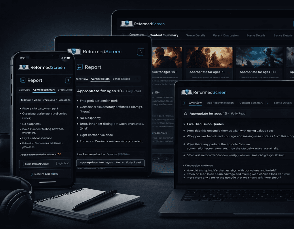 ReformedScreen is a subscription tool that gives Christian parents — Protestant, Catholic, Orthodox, and beyond — instant, customized media vetting reports for movies, TV shows, books, games, and music. Every report is tailored to your exact convictions, from young-earth creationism and regulative worship to your stance on abortion, gender roles, alcohol, premarital relationships, and 60+ other moral, cultural, and theological settings — so nothing slips past your family’s standards.