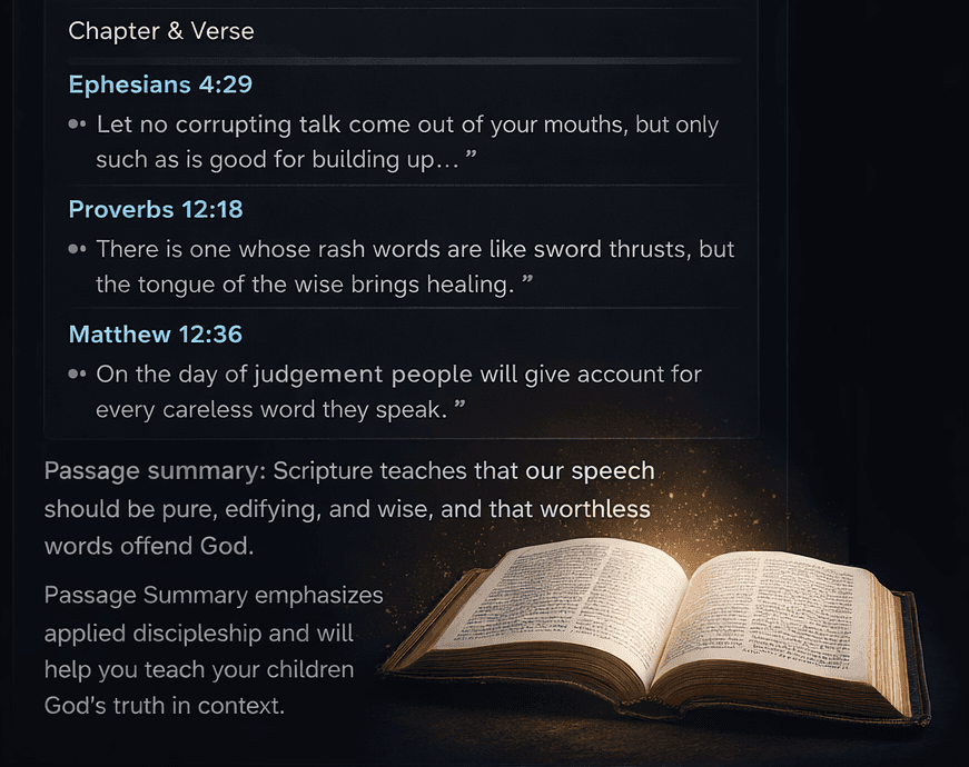 Every report weaves in relevant Bible verses applied directly to the media’s themes — turning entertainment choices into natural opportunities for discipleship and helping you teach your children God’s truth in context.